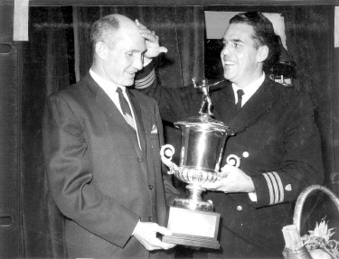 Otto Graham, former star of the Cleveland Browns, pats the bald pate of New York Giants ace quarterback, Y. A. Tittle after receiving trophy as the greatest professional quarterback of all time. Graham, now football coach at the Coast Guard academy and a Coast Guard commander, was chosen in a poll of sports writers conducted by an oil firm. Tittle placed third in the poll.