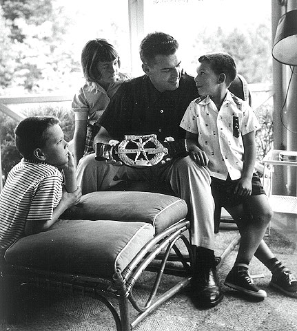 Otto Graham, the Cleveland Browns great quarterback, now retired, shows the Rae Hickok belt, which he won as the Professional Athlete of the Year in 1955, to his children, in his home at Willoughby Hills, a Cleveland suburb. L to R: 9 1/2 year old Duey, 8 year old Sandy, Otto and 5 year old Davey. |